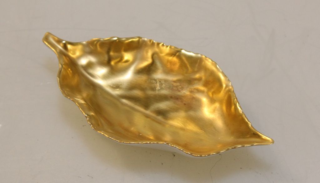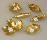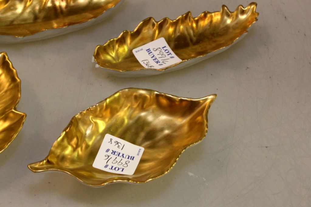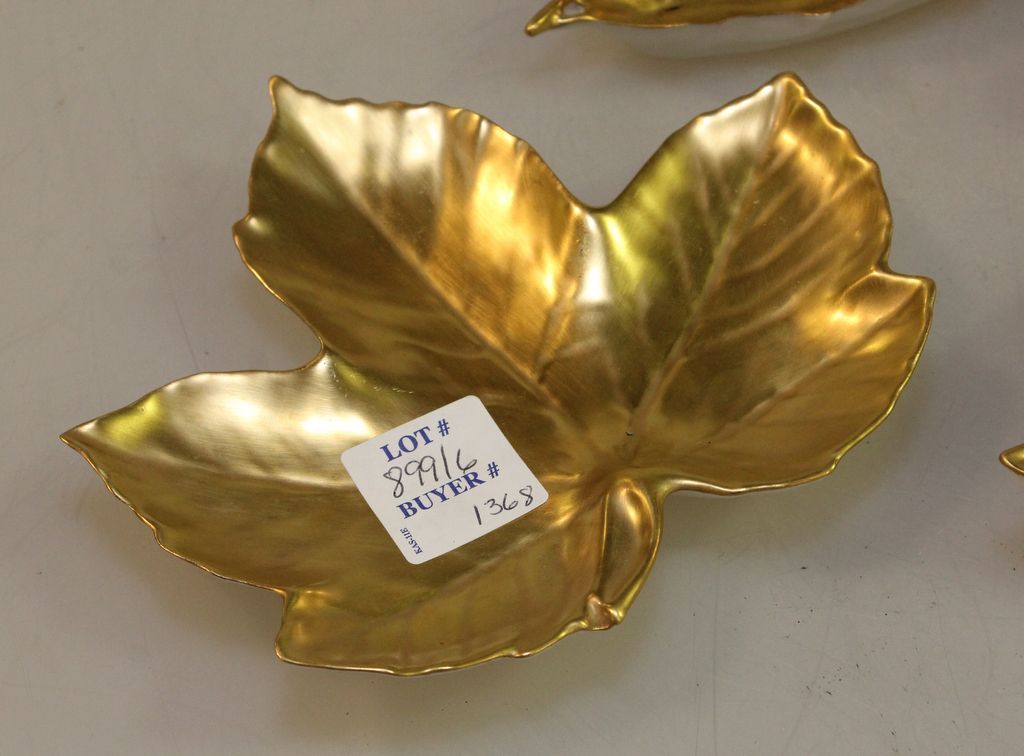 Six William Yeoward Limoges leaf trays or dishes (one broken).; 5 1/2" w. Six William Yeoward Limoges leaf trays or dishes (one broken).; 5 1/2" w.