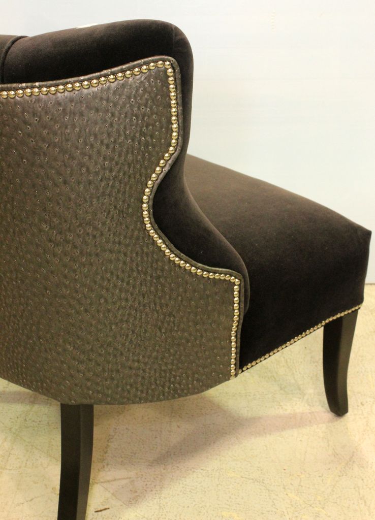 Patagonia Trading Company club chair covered in dotted leather and tufted velvet. Los Angeles, California based company specializes in designer furniture.; 30" w., 21" d., 33" h. Patagonia Trading Company club chair covered in dotted leather and tufted velvet. Los Angeles, California based company specializes in designer furniture.; 30" w., 21" d., 33" h.