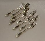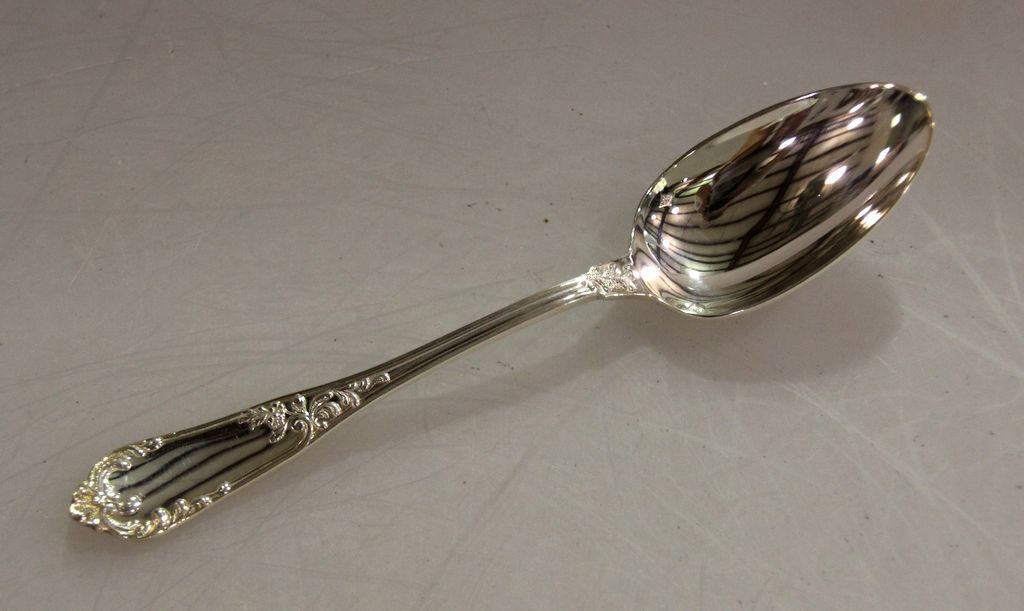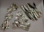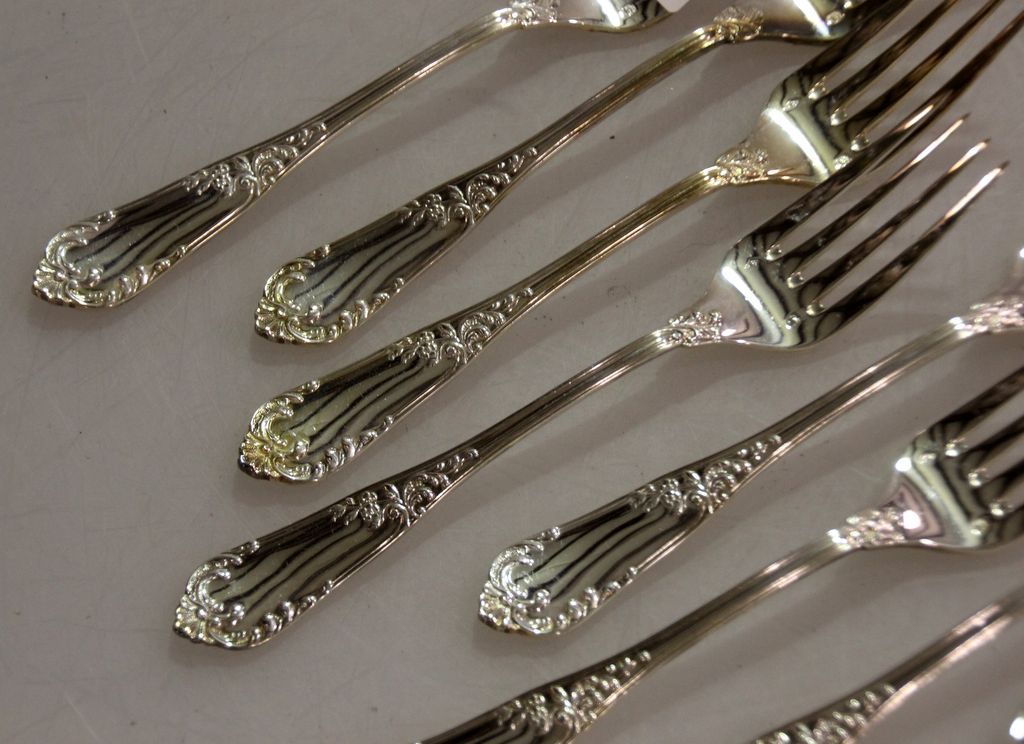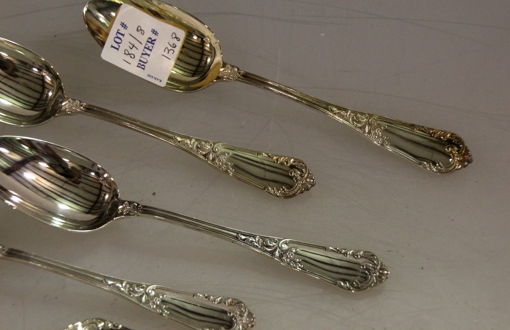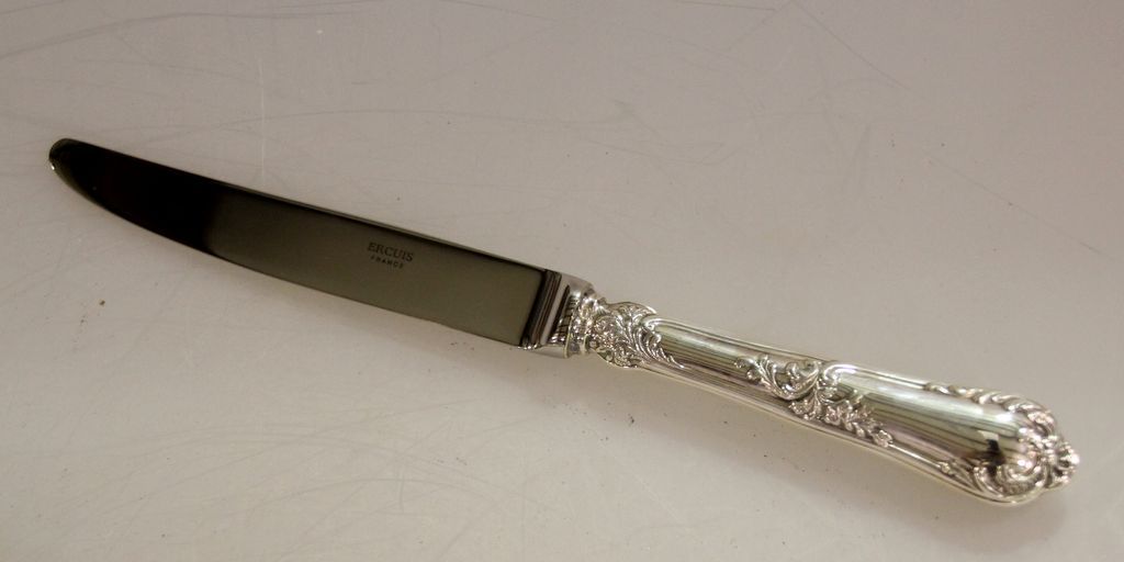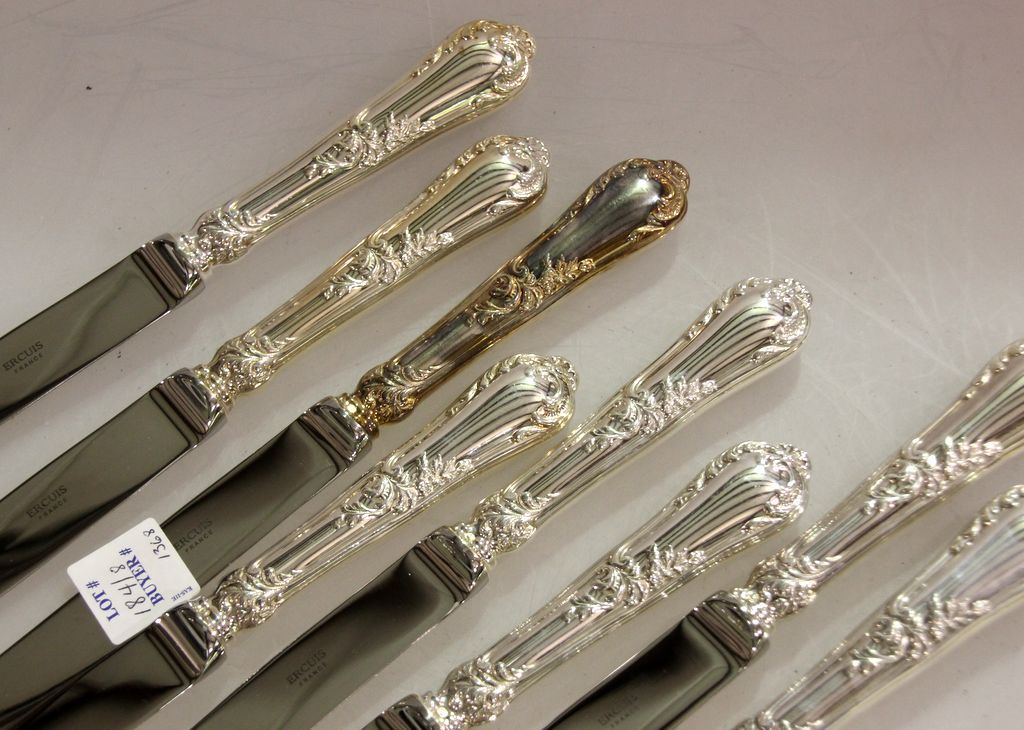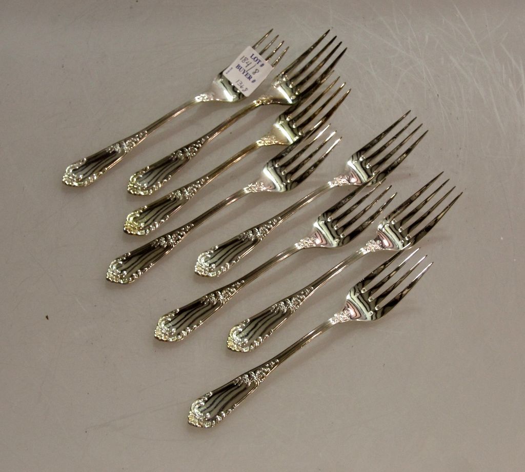 Five place setting for six in Rocaille sterling flatware by Erquis consisting of six dinner forks, six salad forks, six tablespoons, six teaspoons & six knives Five place setting for six in Rocaille sterling flatware by Erquis consisting of six dinner forks, six salad forks, six tablespoons, six teaspoons & six knives
