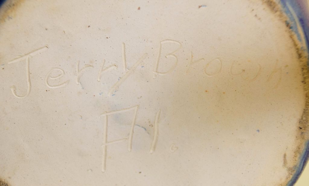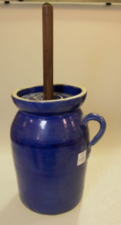 Jerry Brown blue pottery churn; 6" dia., 10" h. Jerry Brown blue pottery churn; 6" dia., 10" h.