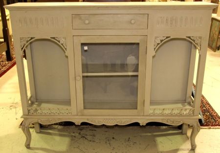 Gray open carved French one door bookcase; 65 1/2" w., 52" h., 14" d. Gray open carved French one door bookcase; 65 1/2" w., 52" h., 14" d.