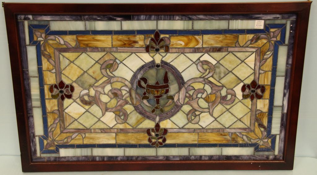 Multicolored stained glass window with urn and flower design.; 36" w., 22" h. Multicolored stained glass window with urn and flower design.; 36" w., 22" h.