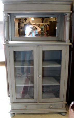 Light blue two door bookcase with hooded top and beveled mirror.; 40" w., 75" h., 17" d. Light blue two door bookcase with hooded top and beveled mirror.; 40" w., 75" h., 17" d.