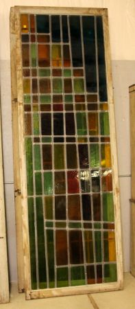 Large stained glass window in wood frame.; 42" w., 9' 11" h. Large stained glass window in wood frame.; 42" w., 9' 11" h.