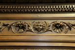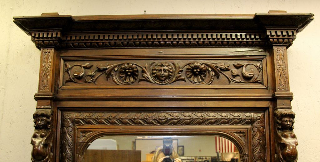 19th century walnut heavily carved vanity dresser with gray marble.; 69" w., 85" h. 19th century walnut heavily carved vanity dresser with gray marble.; 69" w., 85" h.