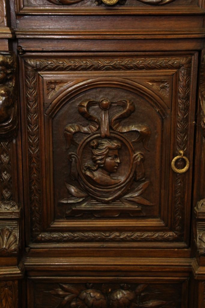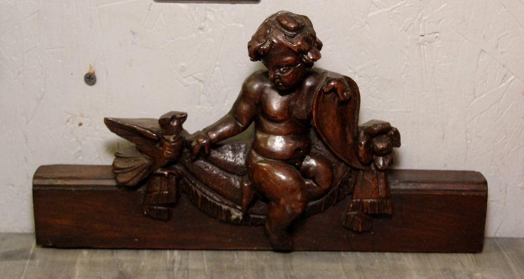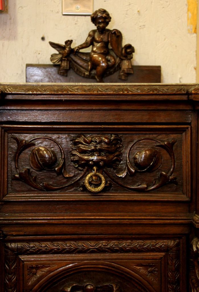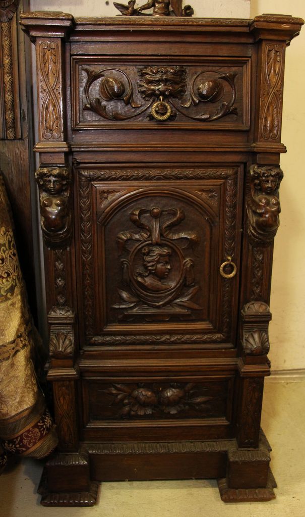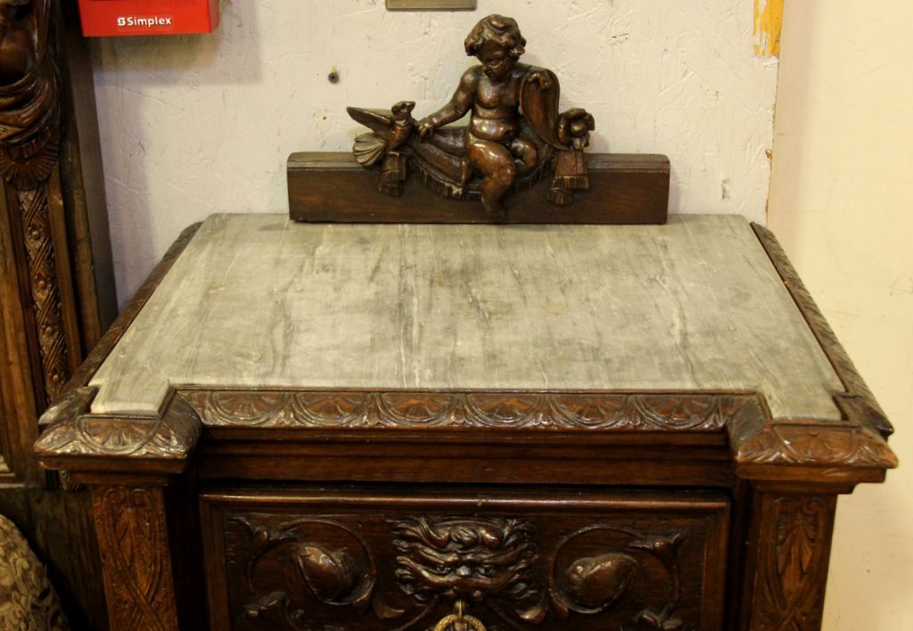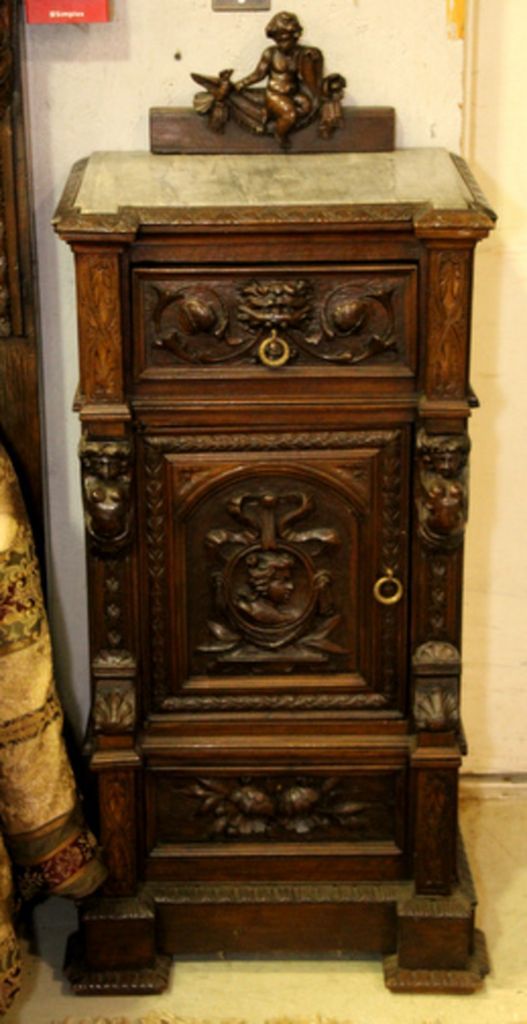 19th century heavily carved bedside commode with carved cupids and grey marble top.; 20 1/2" w., 15" d., 45" h. 19th century heavily carved bedside commode with carved cupids and grey marble top.; 20 1/2" w., 15" d., 45" h.