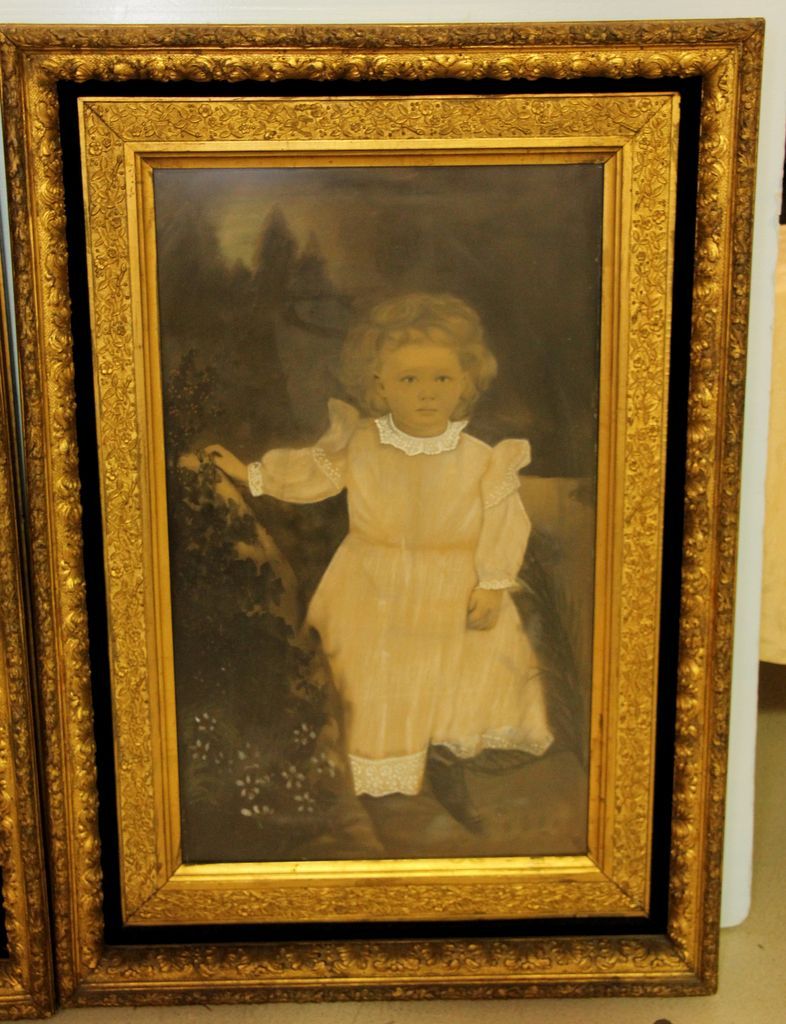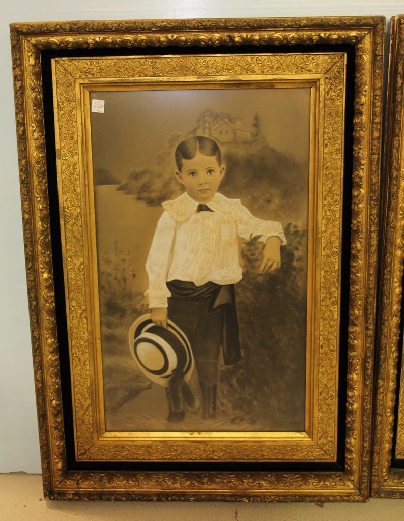 Rare Pair of 1880's Portrait of Young Girl and Boy in Charcoal in original gold leaf frames. 28" w., 41". h. Rare Pair of 1880's Portrait of Young Girl and Boy in Charcoal in original gold leaf frames. 28" w., 41". h.