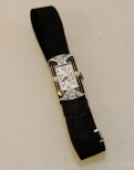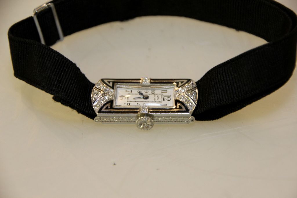 One Swiss, Patek Philippe eighteen jewel mechanical movement #810067, adjusted to eight positions, inside a 29.0x 8.5mm modified rectangular platinum art deco design case with a push/pull flower motif crown and a mineral crystal. Tested: platinum. This movement has a "extract from the archives" certificated, dated July 5, 2013. One integrated black enamel and diamond bezel. Eighteen round single cut diamonds, apx. 1.7- 2.0mm- Apx 0.45cttw #1 grade melee- F-G/ VVS. One off white Arabic dial. One 12.0mm black silk cloth band with a stainless steel locking buckle style clasp. One Swiss, Patek Philippe eighteen jewel mechanical movement #810067, adjusted to eight positions, inside a 29.0x 8.5mm modified rectangular platinum art deco design case with a push/pull flower motif crown and a mineral crystal. Tested: platinum. This movement has a "extract from the archives" certificated, dated July 5, 2013. One integrated black enamel and diamond bezel. Eighteen round single cut diamonds, apx. 1.7- 2.0mm- Apx 0.45cttw #1 grade melee- F-G/ VVS. One off white Arabic dial. One 12.0mm black silk cloth band with a stainless steel locking buckle style clasp.