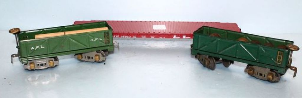 AFL Hoppers marked 3016, approx 7" l.; Flatcar marked ATSF 95025, approx 15" l. O-Gauge AFL Hoppers marked 3016, approx 7" l.; Flatcar marked ATSF 95025, approx 15" l. O-Gauge