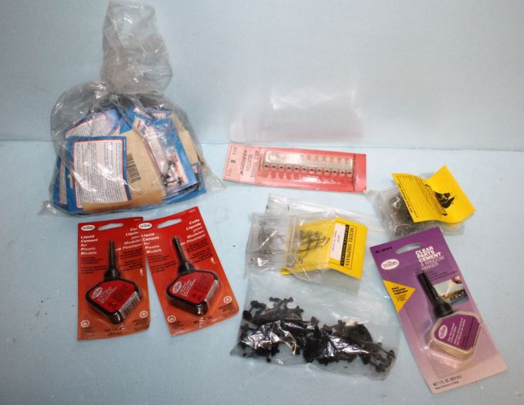 Including model ship fittings, 3 liquid cements, insulated terminal strip & bag of train wheels Including model ship fittings, 3 liquid cements, insulated terminal strip & bag of train wheels