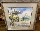 Signed Watercolor of Villagers, matted, framed. Location Hanging in Office 12" x 12" / 17.5" x 17 framed Signed Watercolor of Villagers, matted, framed. Location Hanging in Office 12" x 12" / 17.5" x 17 framed