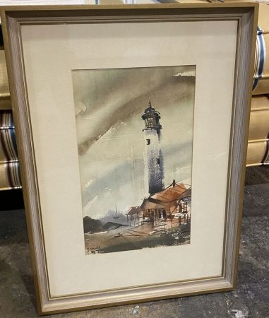 Doris White 1957 Watercolor of Light House, signed, matted, framed. Location Hanging in Office 8.5" x 14" / 16" x 22" framed Doris White 1957 Watercolor of Light House, signed, matted, framed. Location Hanging in Office 8.5" x 14" / 16" x 22" framed