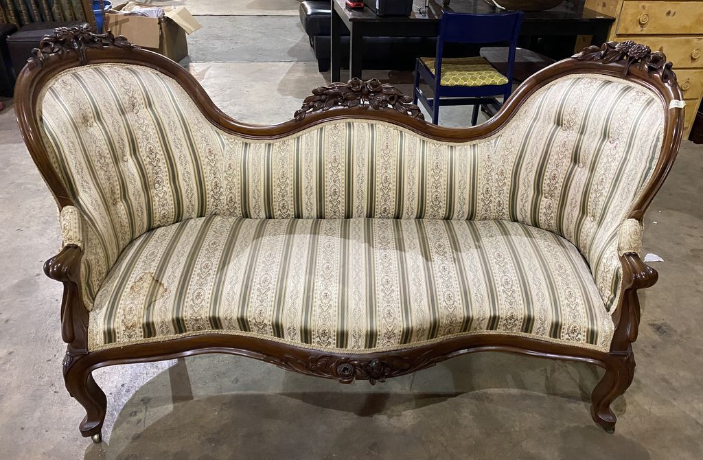 Victorian Style Double Spoon Back Chaise Lounge, mahogany, carved flowers, Cushion has a stain, 66". Row 16 Victorian Style Double Spoon Back Chaise Lounge, mahogany, carved flowers, Cushion has a stain, 66". Row 16