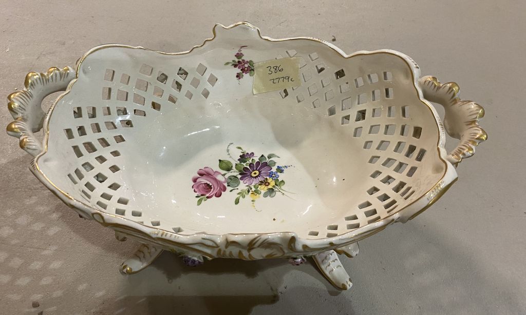 Von Schierholz Porcelain Footed Centerpiece Bowl, Crown mark, 5"h., 11"w. Location Metal Shelves Von Schierholz Porcelain Footed Centerpiece Bowl, Crown mark, 5"h., 11"w. Location Metal Shelves
