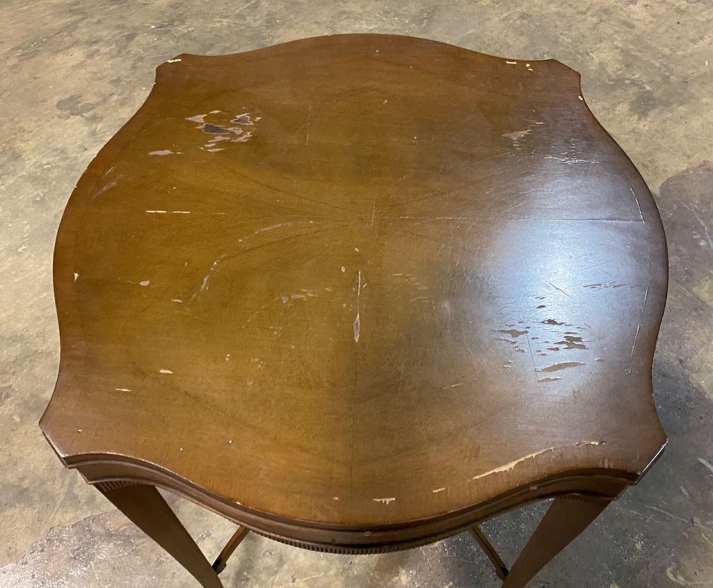 Vintage French Style End Table, has worn spots on top, mahogany. 16" 16" d 27" h. Row 3 Vintage French Style End Table, has worn spots on top, mahogany. 16" 16" d 27" h. Row 3