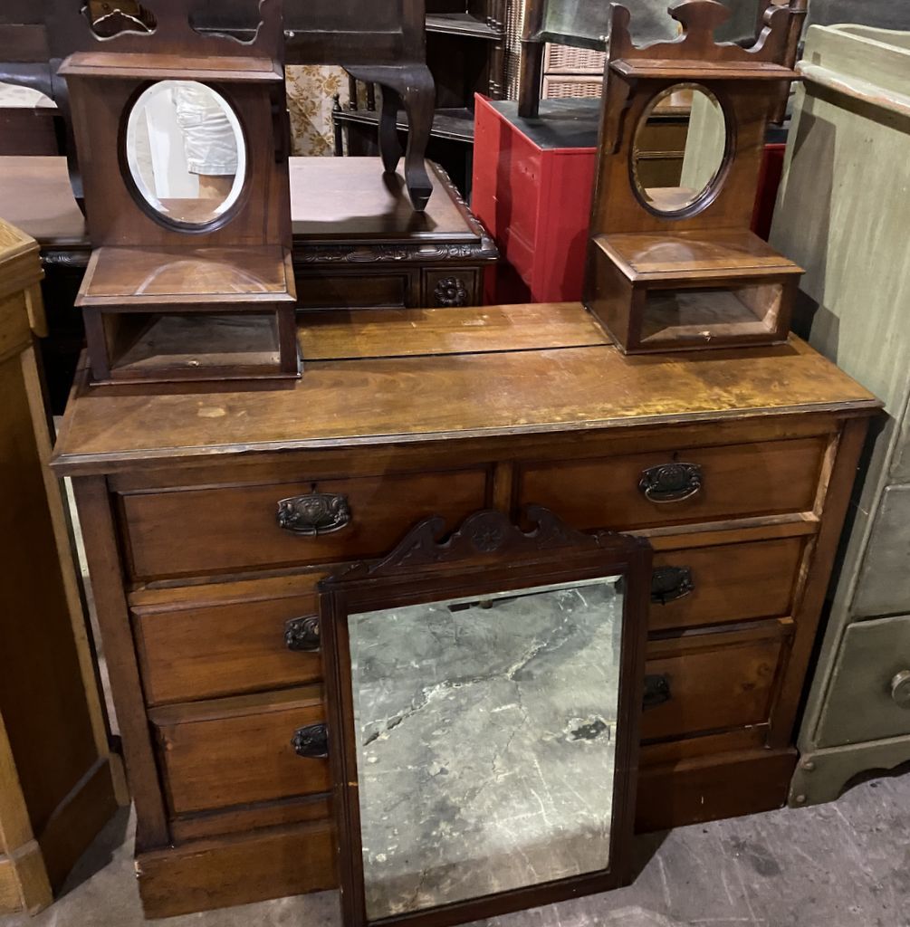 Vintage Traditional Style Dresser, two side mirrors and center mirror, needs some work. 32"h., 42"w., 17"d. Row 9 Vintage Traditional Style Dresser, two side mirrors and center mirror, needs some work. 32"h., 42"w., 17"d. Row 9