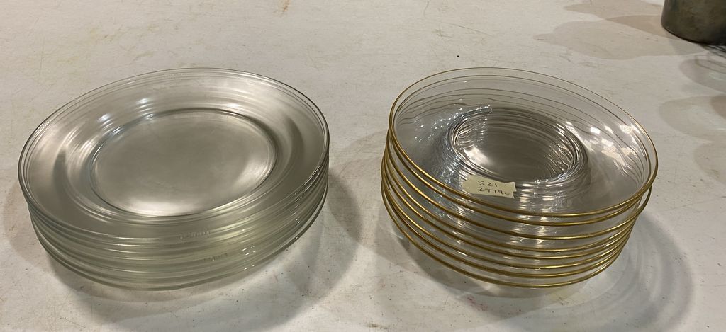 Group of Glass Plates, one group with gold rim, Location Metal Shelves Group of Glass Plates, one group with gold rim, Location Metal Shelves