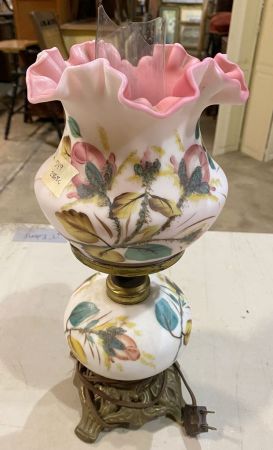 Fenton Style Glass Oil Style Lamp, hand painted, ruffled shade, broken hurricane shade, 14"h. Location Metal Shelves Fenton Style Glass Oil Style Lamp, hand painted, ruffled shade, broken hurricane shade, 14"h. Location Metal Shelves