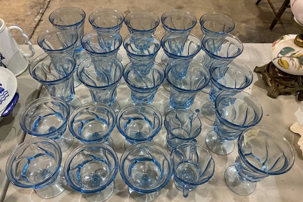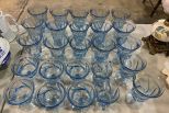 24 Fostoria Blue Jamestown Glasses, sherbets, and Water Goblets. Location Metal Shelves 24 Fostoria Blue Jamestown Glasses, sherbets, and Water Goblets. Location Metal Shelves