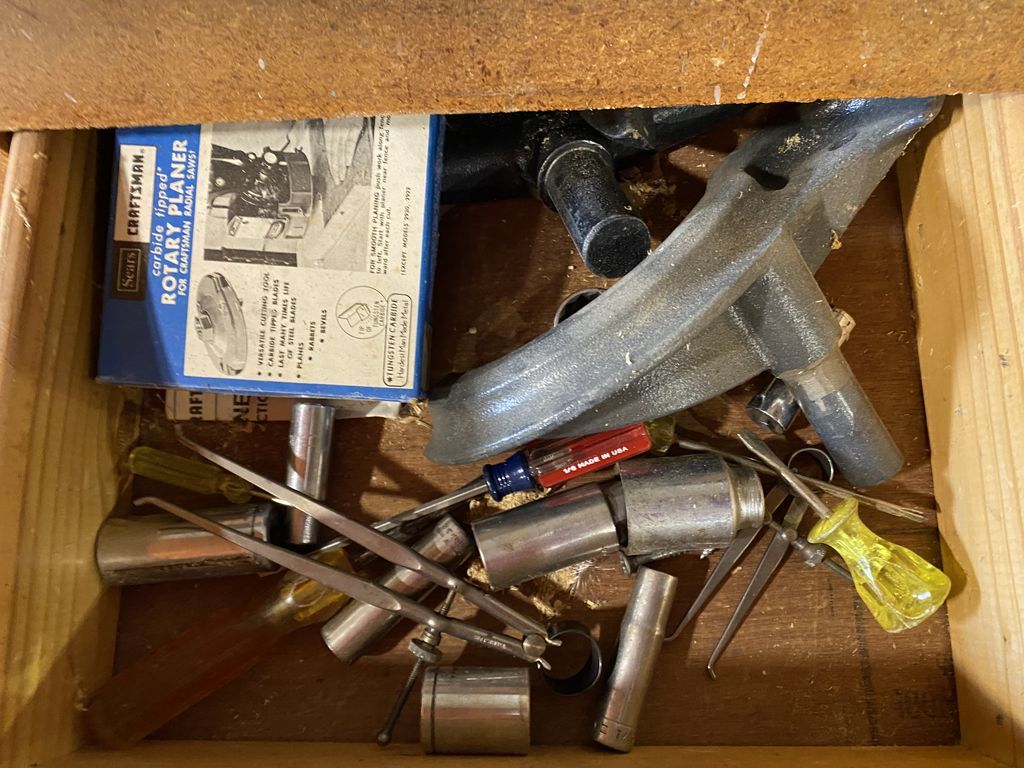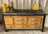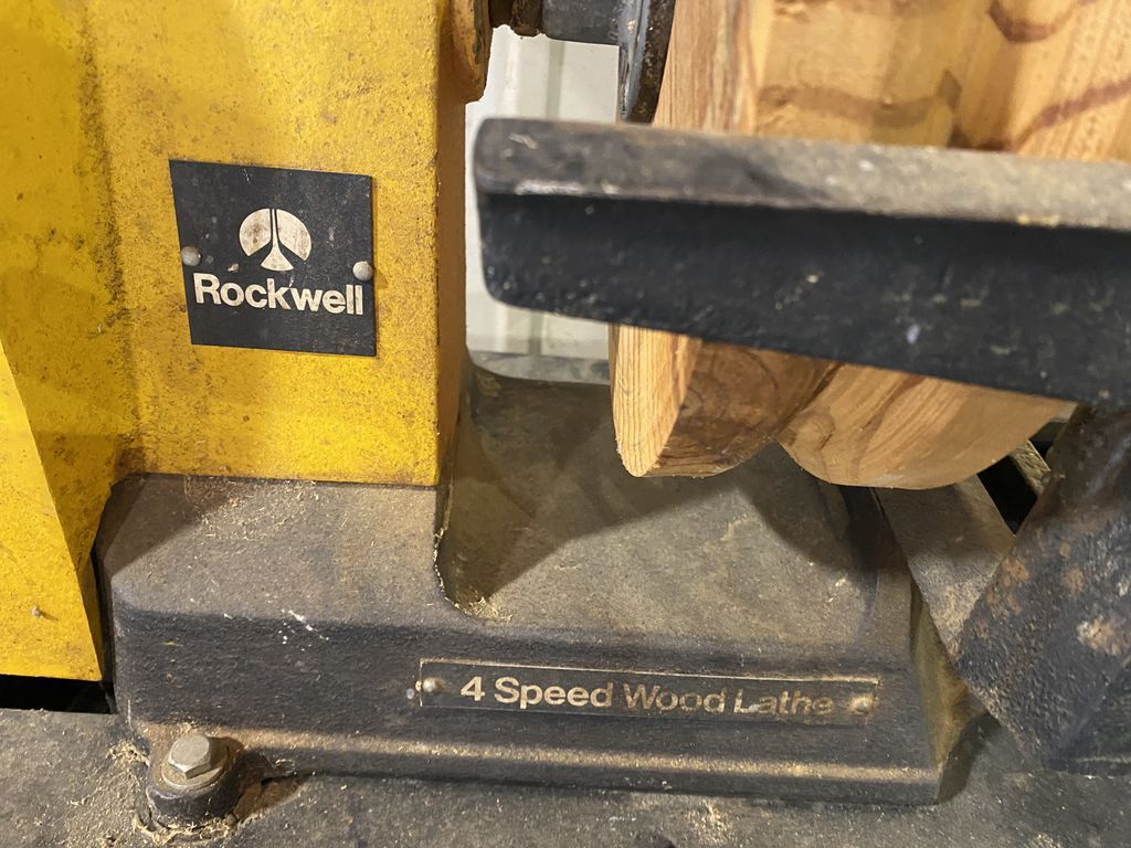 Rockwell 4 Speed Lathe, wood base with storage drawers, drawers have carved tools. Location Front Wall Rockwell 4 Speed Lathe, wood base with storage drawers, drawers have carved tools. Location Front Wall