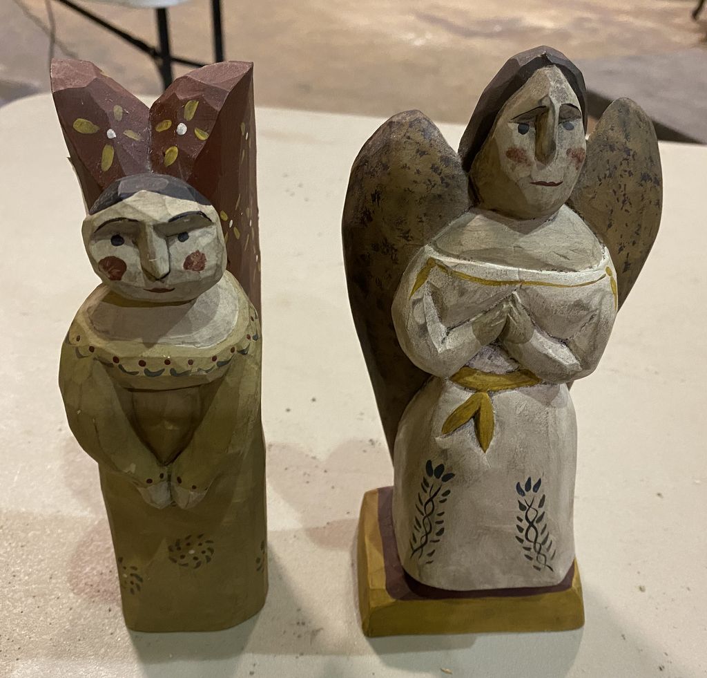 P. Koosed Wood Figurines, hand crafted, 8"h. Location Metal Shelves P. Koosed Wood Figurines, hand crafted, 8"h. Location Metal Shelves