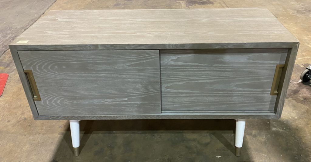 Mid Century Reproduction Console Table, two sliding doors, has light wear, 24"h., 45"w. Row 14 Mid Century Reproduction Console Table, two sliding doors, has light wear, 24"h., 45"w. Row 14