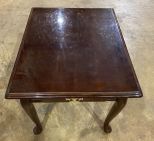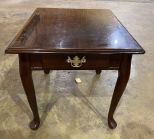 Queen Anne Cherry Side Table, single Drawer, has scratches. 21" w 22" d 21" h. Row 8 Queen Anne Cherry Side Table, single Drawer, has scratches. 21" w 22" d 21" h. Row 8
