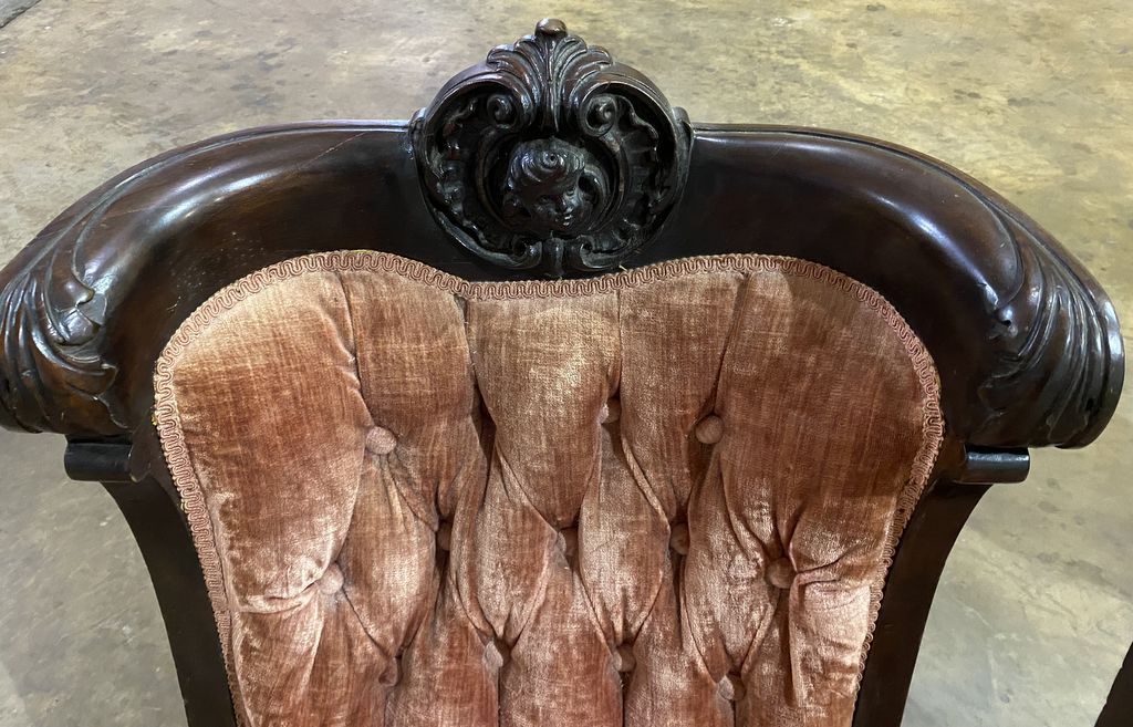 Antique Empire Style Parlor Chairs, carved face crest, seats are worn. Row 8 Antique Empire Style Parlor Chairs, carved face crest, seats are worn. Row 8