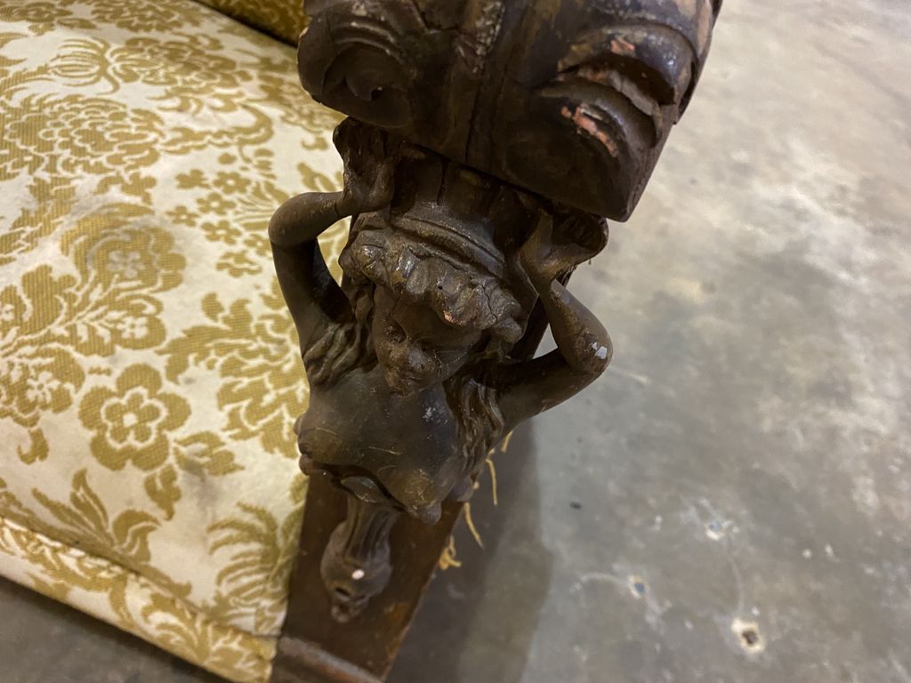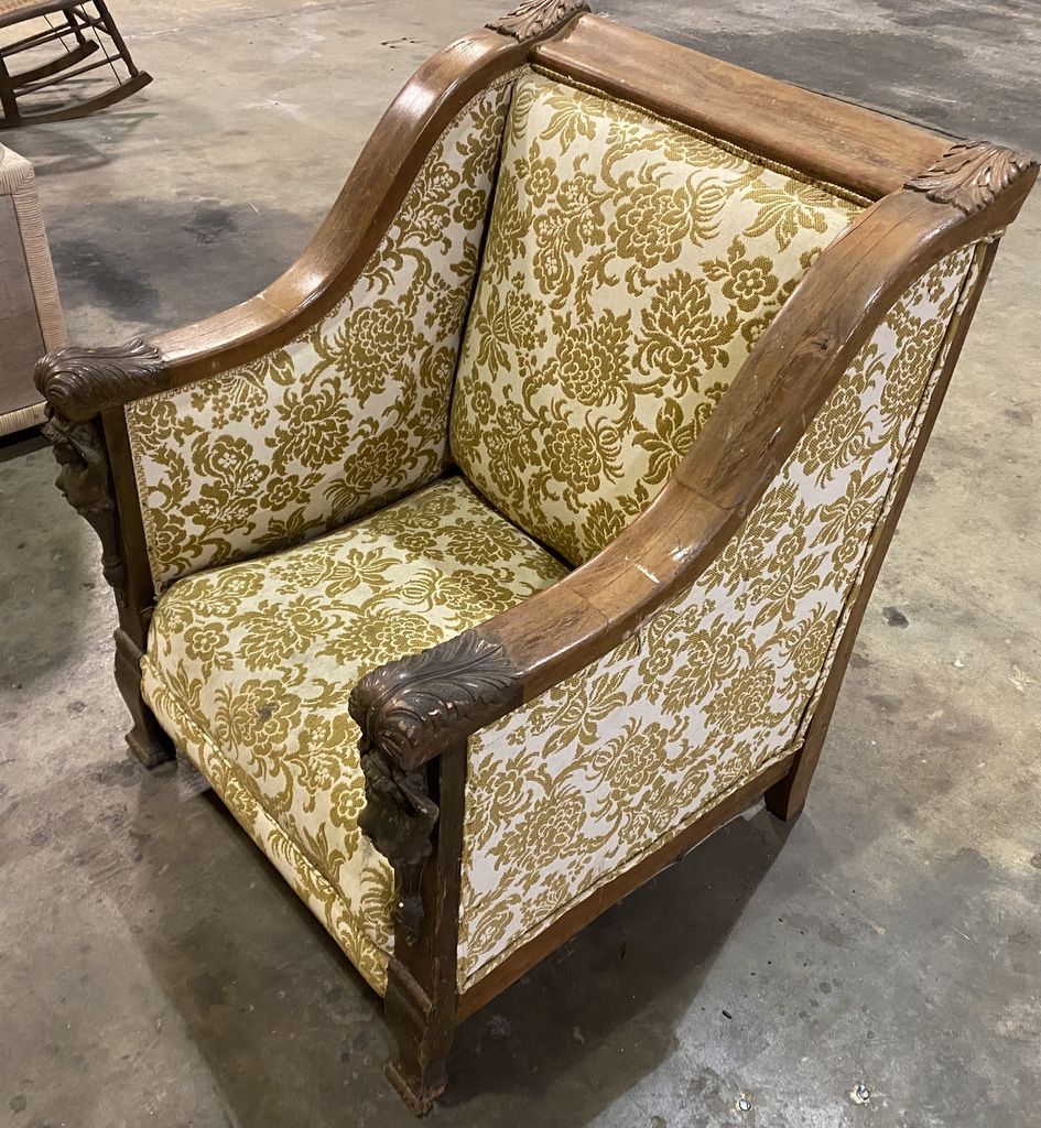 Large Empire Style Gentleman's Chair, mahogany, carved north wind faces, needs work, work condition. Row 8 Large Empire Style Gentleman's Chair, mahogany, carved north wind faces, needs work, work condition. Row 8