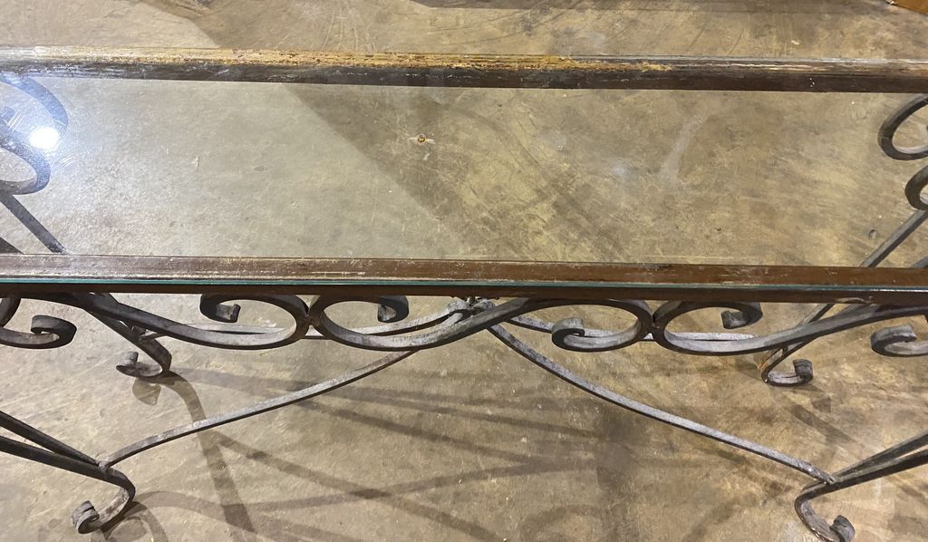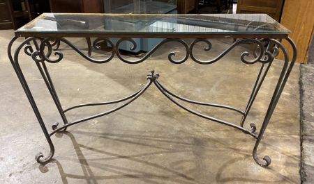 Wrought Iron Console Table, glass top, needs cleaning, 31"h., 48"w. Row 13 Wrought Iron Console Table, glass top, needs cleaning, 31"h., 48"w. Row 13