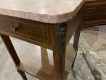 French Empire Marble Top Side Table, brass ormolu, single drawer, walnut, has wear, 27"h., 15"w. Row 12 French Empire Marble Top Side Table, brass ormolu, single drawer, walnut, has wear, 27"h., 15"w. Row 12