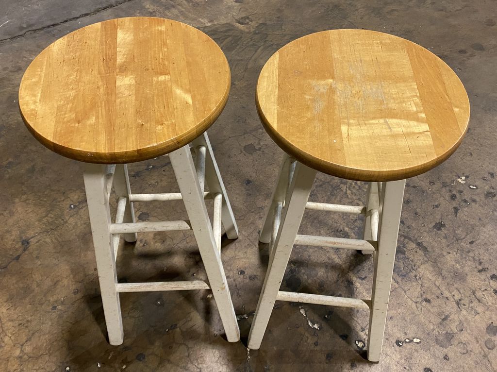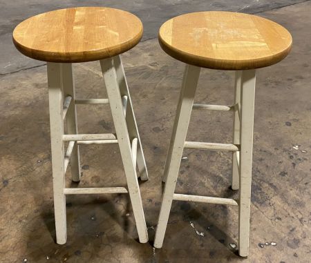 Pair of Pine Bar Stools, white painted base. Row 1 Pair of Pine Bar Stools, white painted base. Row 1