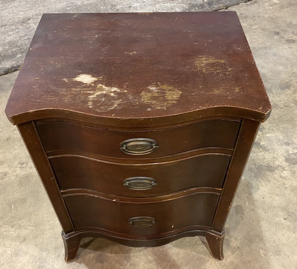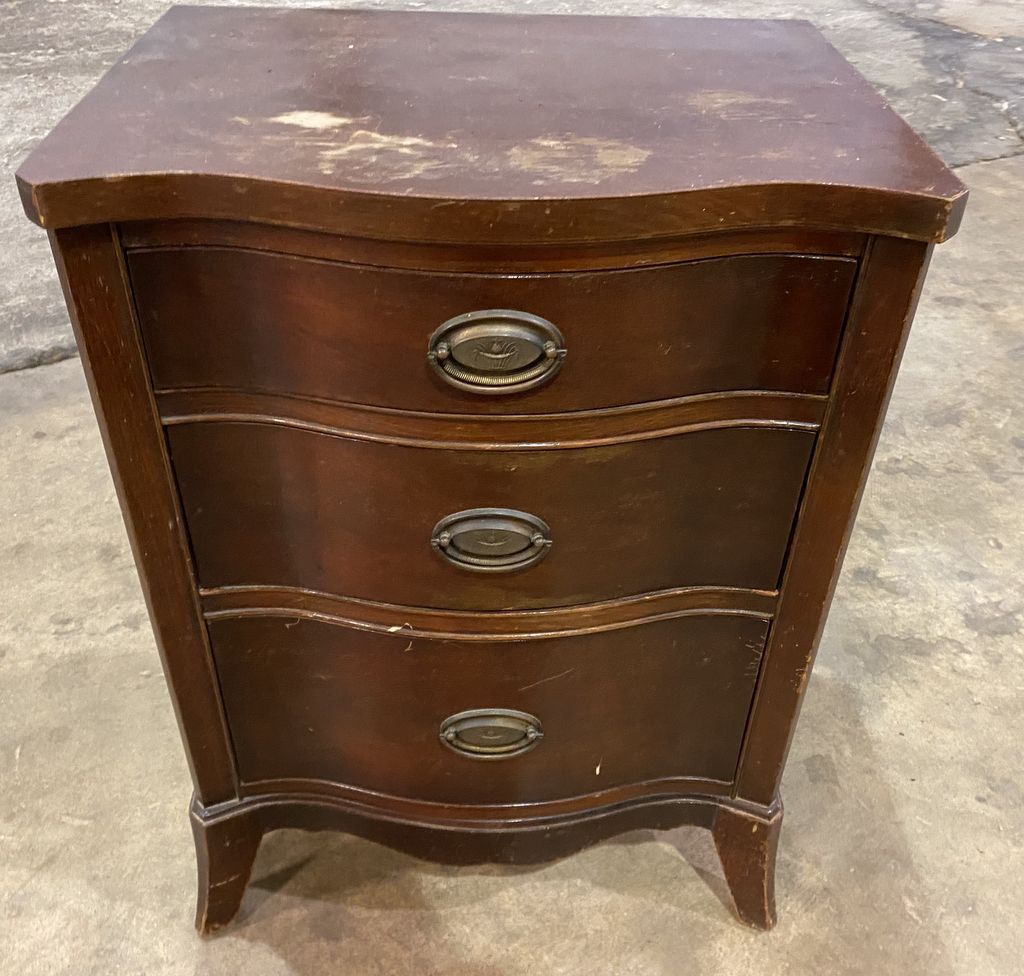 Duncan Phyfe Night Stand, mahogany, three drawers, worn spots on top. 20" w 15" d 27" h. Row 5 Duncan Phyfe Night Stand, mahogany, three drawers, worn spots on top. 20" w 15" d 27" h. Row 5