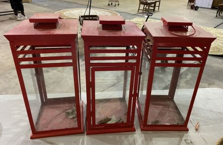 Three Red Candle Lanterns, glassed, metal. Location Metal Shelves Three Red Candle Lanterns, glassed, metal. Location Metal Shelves