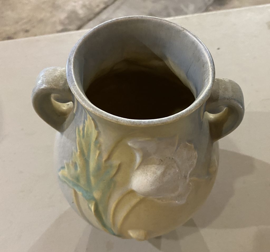 Roseville Soft Blue Poppy Vase . Location Metal Shelves Roseville Soft Blue Poppy Vase . Location Metal Shelves