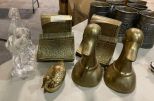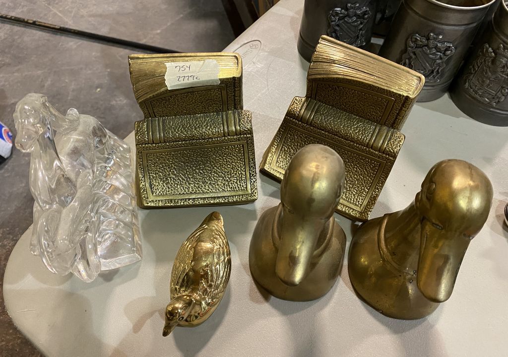 Glass Deer bookend, pair of brass bookends, pair of brass ducks, and duck. Glass Deer bookend, pair of brass bookends, pair of brass ducks, and duck.