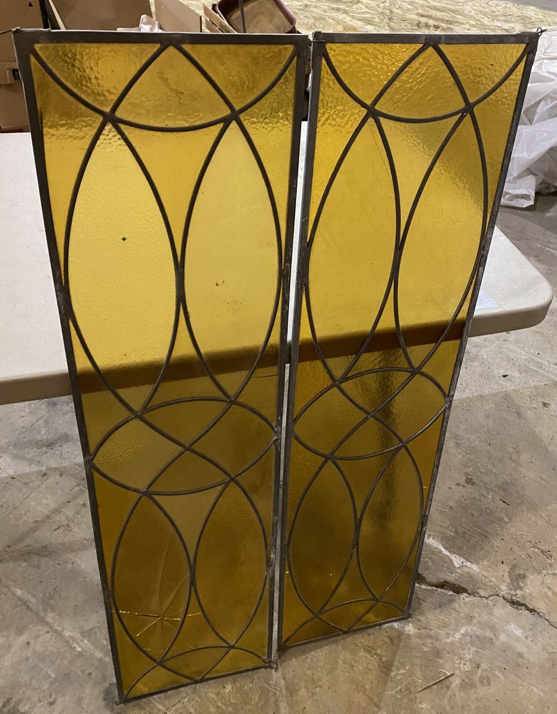 Pair of Amber Stained Glass Panels, metal framed, one has cracks. Pair of Amber Stained Glass Panels, metal framed, one has cracks.
