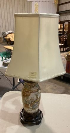 Vintage Porcelain Satsuma Vase Lamp, with shade, 27"h. Location Metal Shelves Vintage Porcelain Satsuma Vase Lamp, with shade, 27"h. Location Metal Shelves