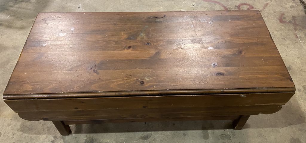 Farm House Style Drop Leaf Coffee Table, pine, needs cleaning. 4' w 22" d 18" h. Row 7 Farm House Style Drop Leaf Coffee Table, pine, needs cleaning. 4' w 22" d 18" h. Row 7