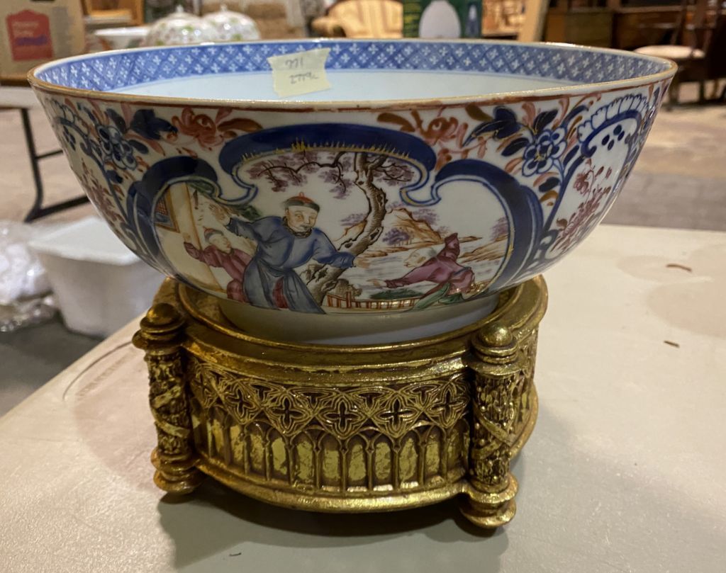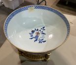 Chinese Porcelain Fruit Bowl, gold gilt stand, 10"dia. Location Metal Shelves Chinese Porcelain Fruit Bowl, gold gilt stand, 10"dia. Location Metal Shelves