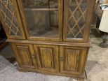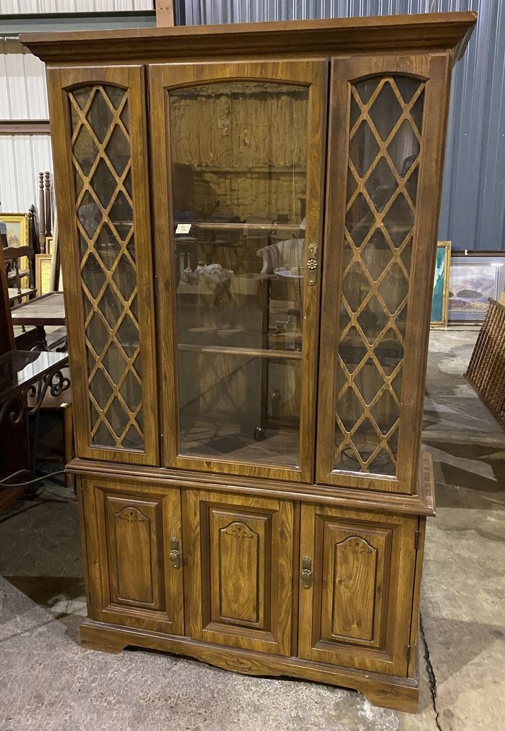 Late 2Oth Century Two Piece China Cabinet, oak finish, lighted, 77"h., 45"w. 17"d. Row 13 Late 2Oth Century Two Piece China Cabinet, oak finish, lighted, 77"h., 45"w. 17"d. Row 13