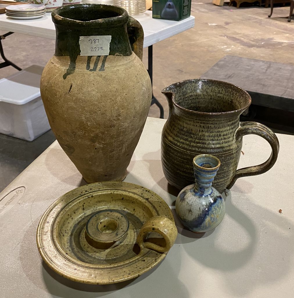 Four Pottery Stoneware Pieces, Pitcher, Vase, and Candle Holder. Location Metal Shelves Four Pottery Stoneware Pieces, Pitcher, Vase, and Candle Holder. Location Metal Shelves