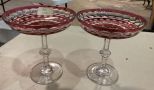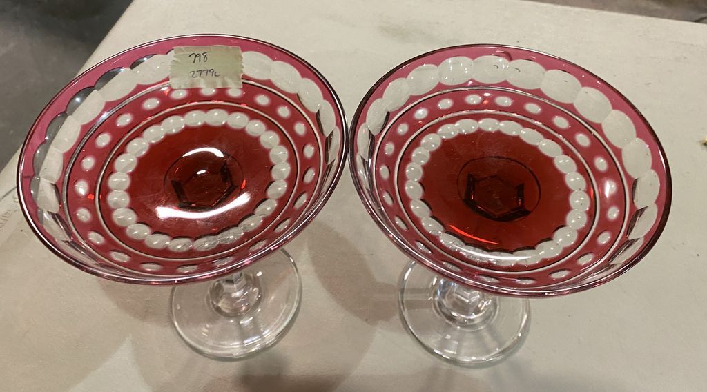 Cranberry Cut to Clear Style Compotes, 6 1/2"h., 6"dia. Location Metal Shelves Cranberry Cut to Clear Style Compotes, 6 1/2"h., 6"dia. Location Metal Shelves