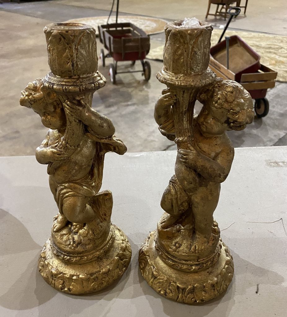 Pair of Child Figural Candle Holders, gold painted, aged condition. Location Metal Shelves Pair of Child Figural Candle Holders, gold painted, aged condition. Location Metal Shelves