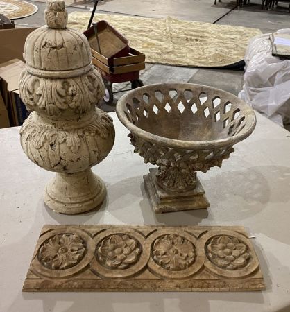 Decorative Center Piece Compote, Urn, and Plaque, Location Metal Shelves Decorative Center Piece Compote, Urn, and Plaque, Location Metal Shelves
