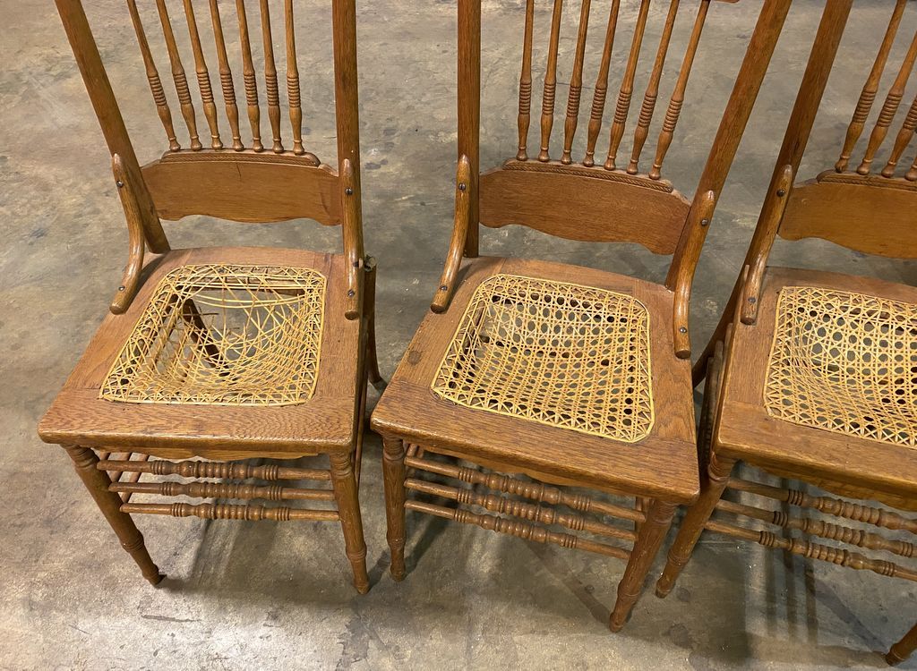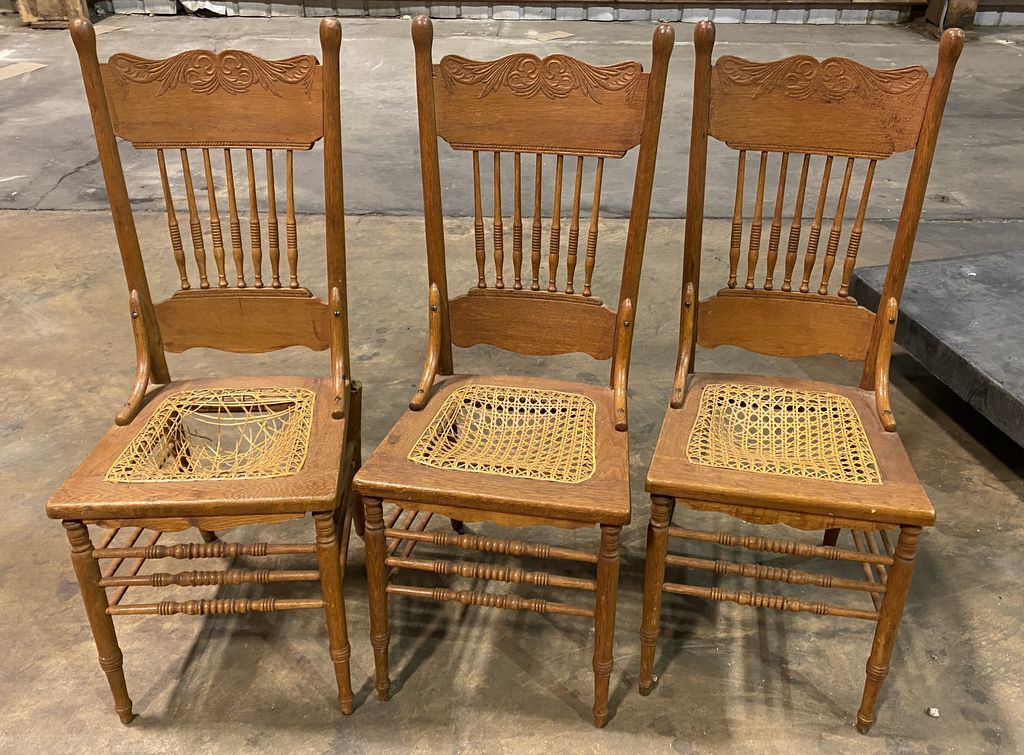 Three Oak Pressed Back Dining Chairs, caned seats, seats are damaged. Three Oak Pressed Back Dining Chairs, caned seats, seats are damaged.