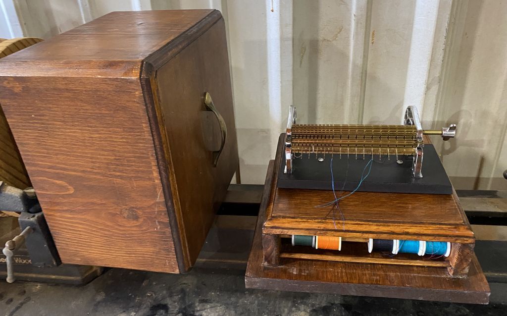 Smock Gathering Machine, oak case. Location Front Wall Smock Gathering Machine, oak case. Location Front Wall