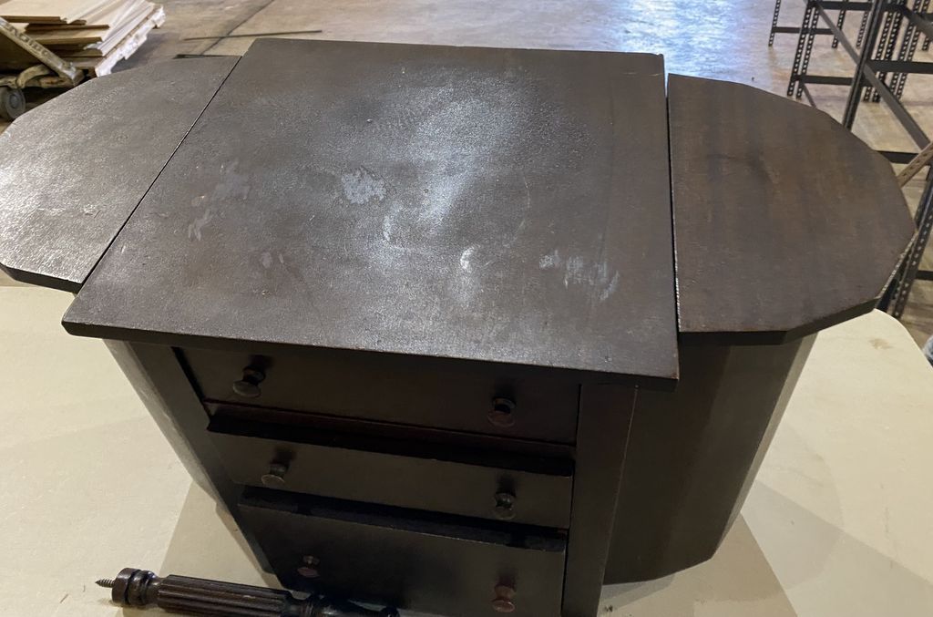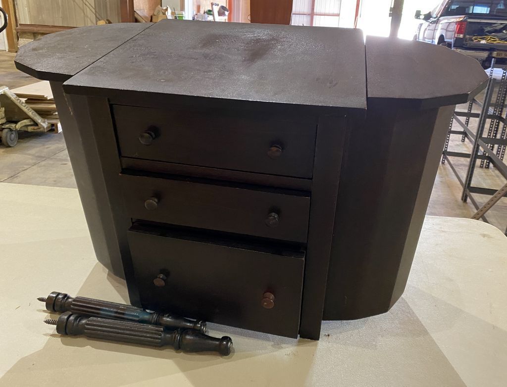 Vintage Sewing Cabinet, drawers, two slots, missing two legs. Row 9 Vintage Sewing Cabinet, drawers, two slots, missing two legs. Row 9