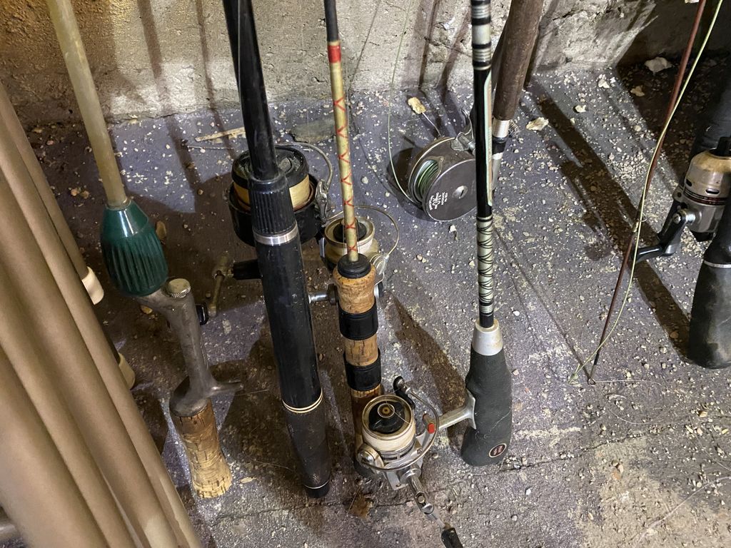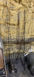 Group of Fishing Rods, Spin cast, Shakespeare fly rod, some rods. Back Wall Group of Fishing Rods, Spin cast, Shakespeare fly rod, some rods. Back Wall