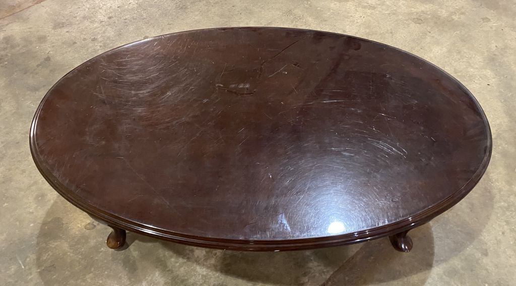 Cherry Queen Anne Coffee Table, has swirls on finish. 48" w 22" d 16" h. row 7 Cherry Queen Anne Coffee Table, has swirls on finish. 48" w 22" d 16" h. row 7